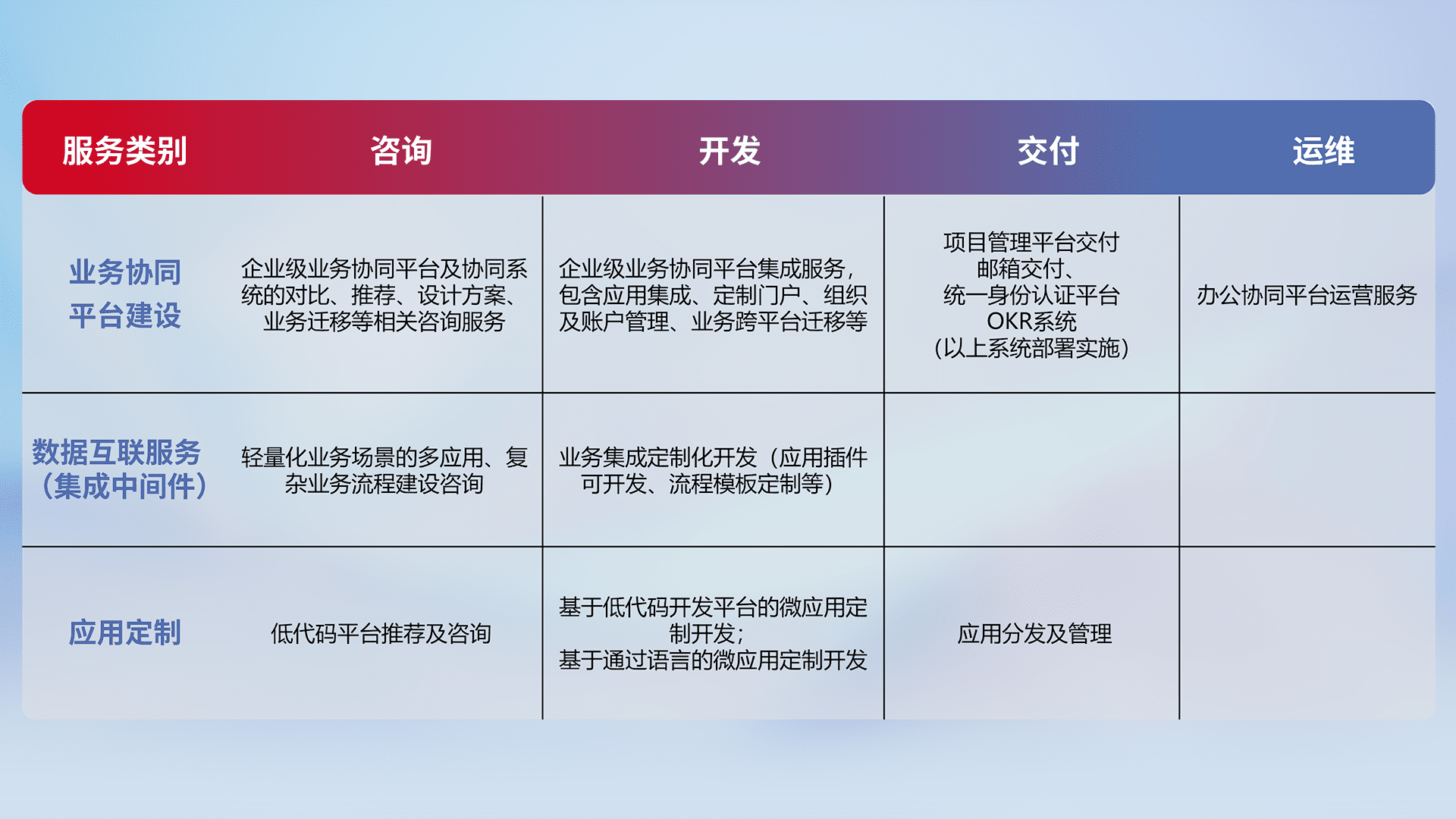 针对钉钉、、企微、、、、IDaas等平台级产品提供产品的规划、、、、方案、、、、交付、、、定制化开发等服务,,,实现如统一协同办公、、智能客户服务、、、、混合会议管理、、、、智能数据查询、、、、等业务场景,,实现数字化转型。。。