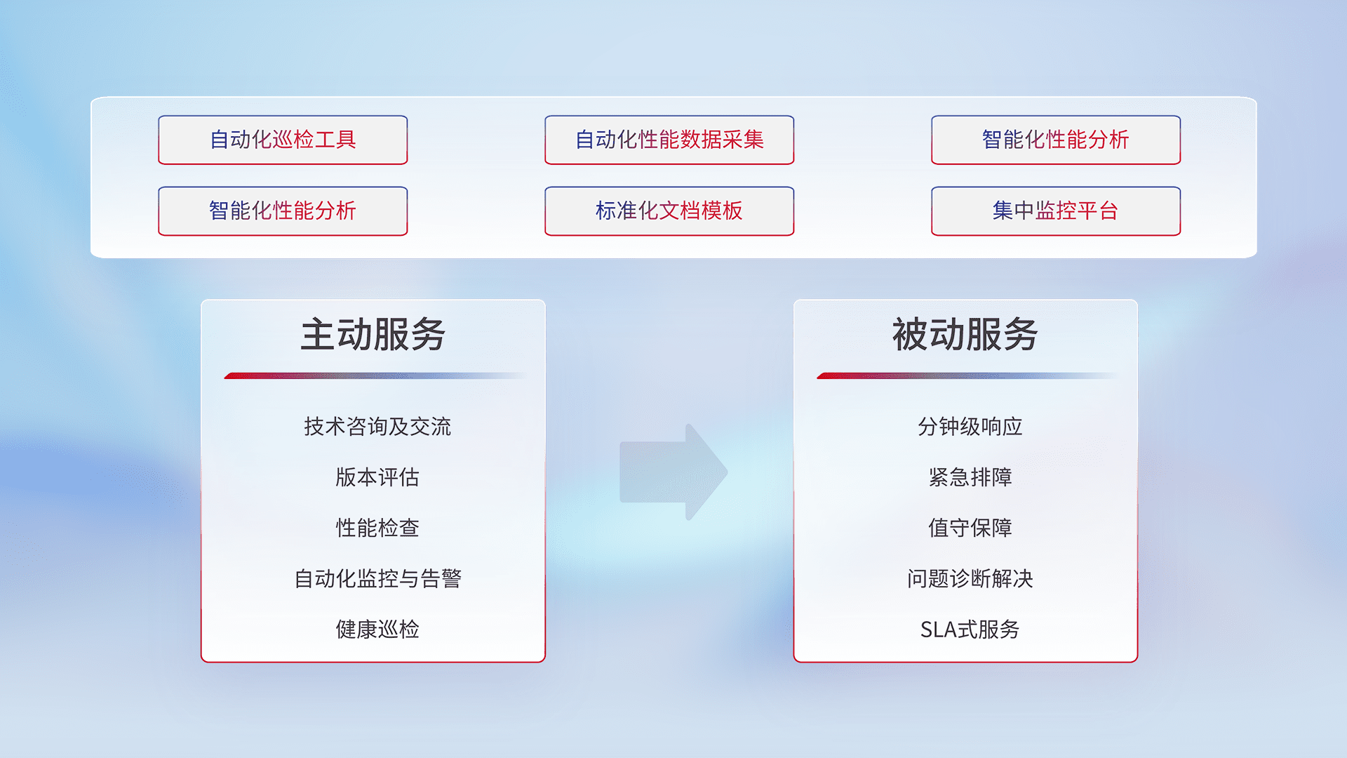 智能化工具和标准化文档,,保障服务质量,,,,提供主动服务(包含技术咨询、、、、版本评估、、、、性能检查、、、自动化监控与告警、、健康巡检)和被动服务包含(分钟级响应、、紧急排障、、值守保障、、、问题诊断解决、、SLA服务)。。。