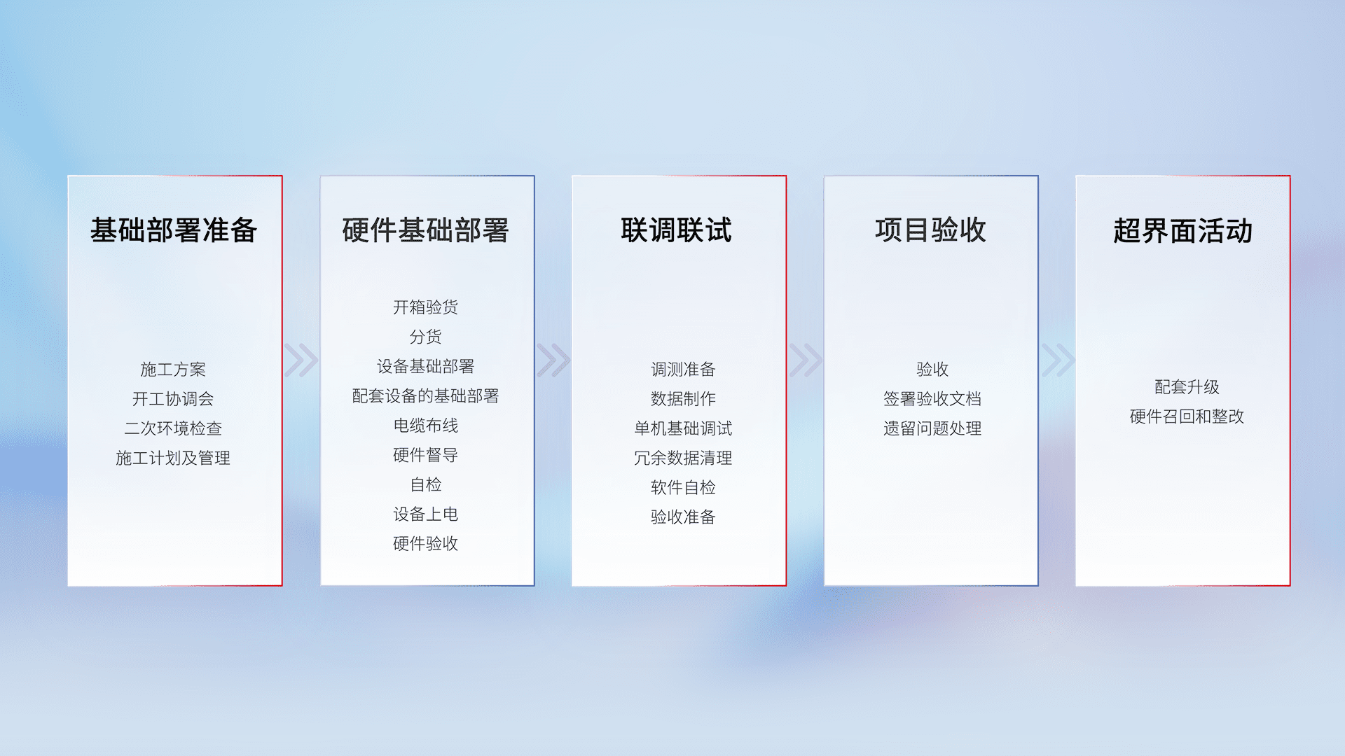 从基础部署准备、、、硬件基础部署、、、联调联试、、、项目验收、、、越界面活动的全过程可追溯,,保证施工质量和进度。。。。